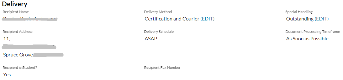 | Tracking ID | Displays the Delivery Method. For ApplyAlberta displays the ApplyAlberta Transcript Request Identifier or for Electronic displays Transcript Request Identifier if it is not null. Otherwise, displays a blank value. |