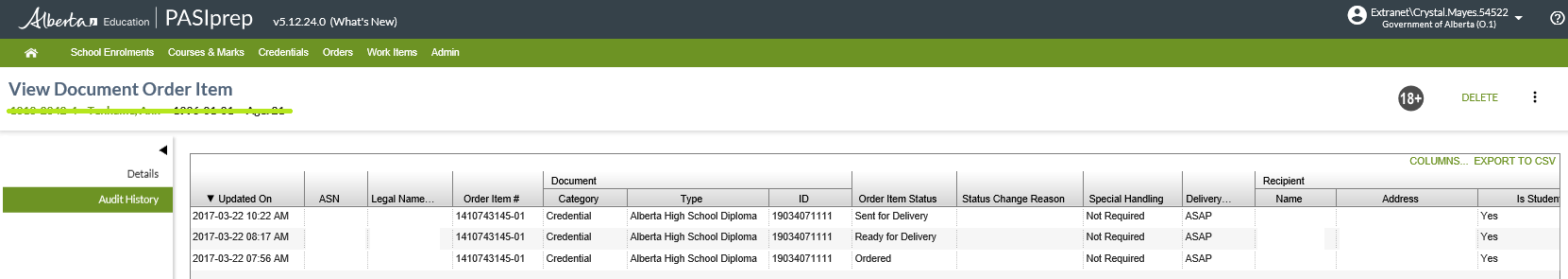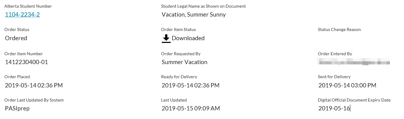 | ASN | Displays the Alberta Student Number of the student associated to the Document Order Item record. |