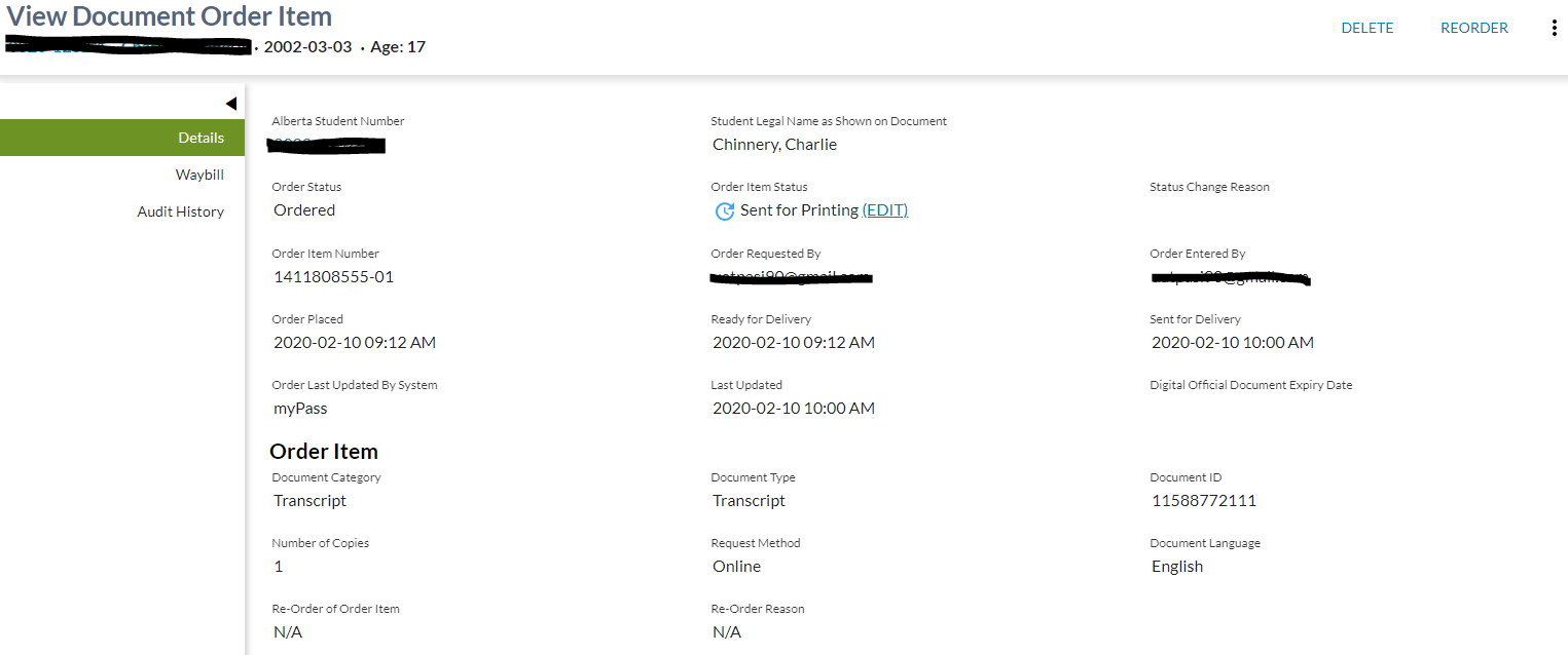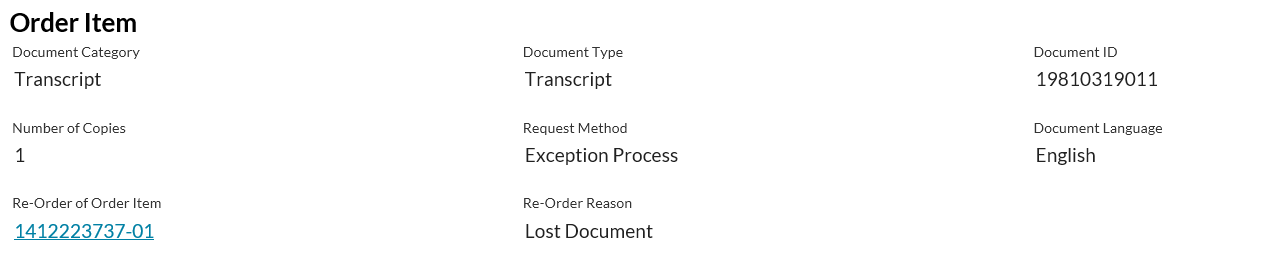 This screen allows user to view full details regarding a Document Order Item record. This applies to document order items for transcripts, credentials and letters. Different sections and content will be displayed for each type of document.