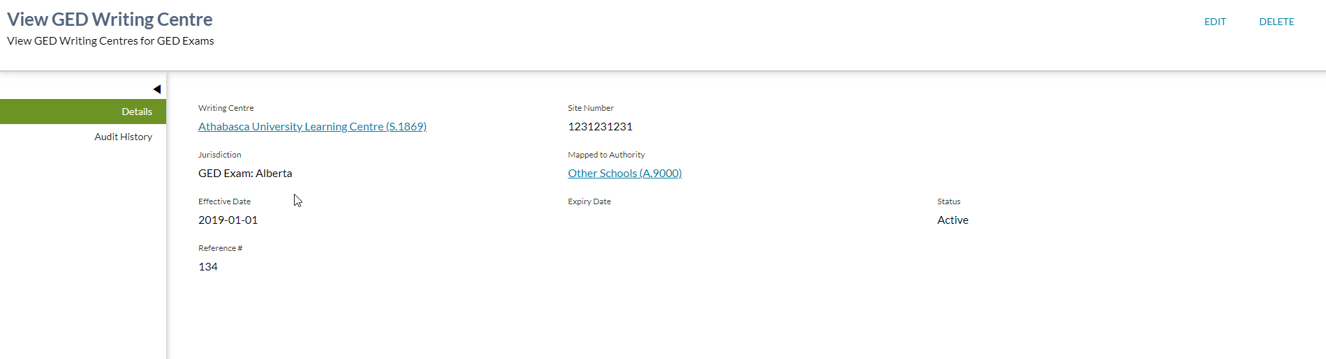 Expiry DateDisplays the GED Writing Centre Expiry Date if one exists.