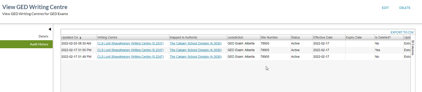 This section contains a PASIprep Audit History Grid which lists all changes made to the GED Writing Centre record. This is derived from GED Writing Centre Audit Information.