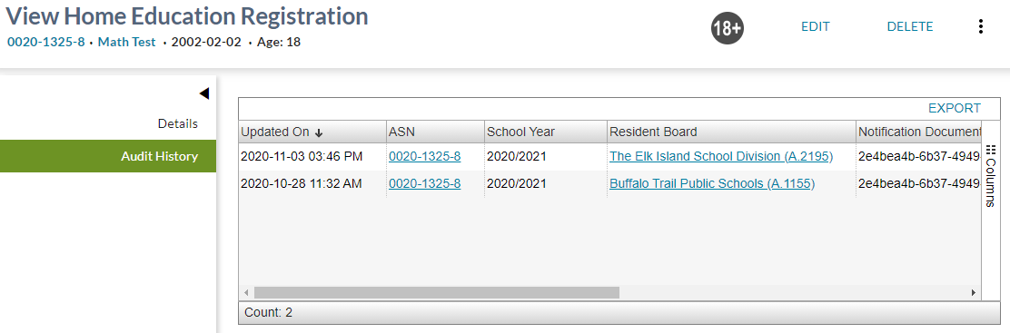 This data grid contains a record for each of the Home Education Registration Audit Event records.