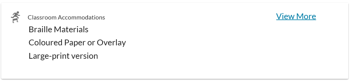 This card lists a distinct list of all classroom accommodations that the student has recently received and/or is currently receiving. Records are only displayed on the card where: