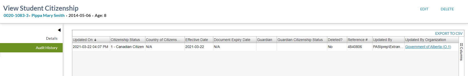 This section contains a PASIprep Audit History Grid which lists all changes made to the Student Citizenship record. This is derived from Student Audit Events with the Audit Subject of: