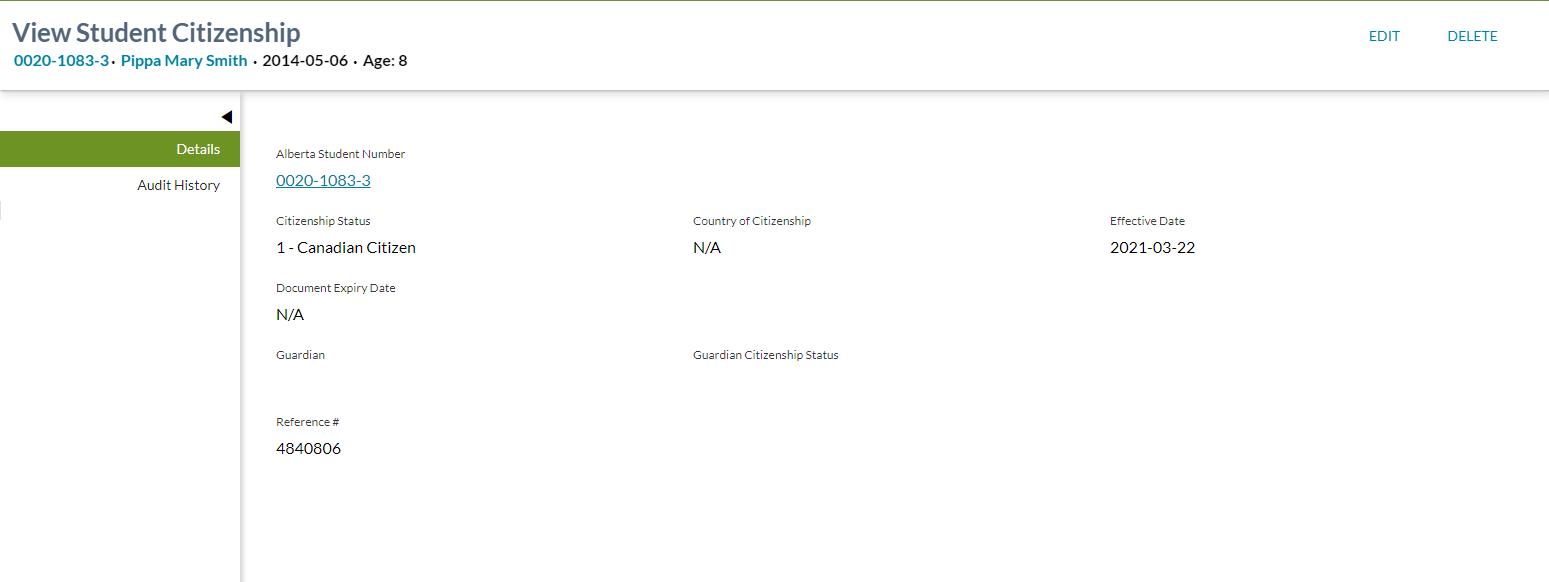 | EDIT | Selecting this action will open the Edit Student Citizenship page. Note: The action will be visible if the user has PASIprep Level 02 Permission - Manage Student Information and an association By Last School Enrolment, or higher. |