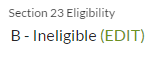 Where the user has the appropriate permissions (see Secured By), the “EDIT” link next to Section 23 Eligibility is visible.