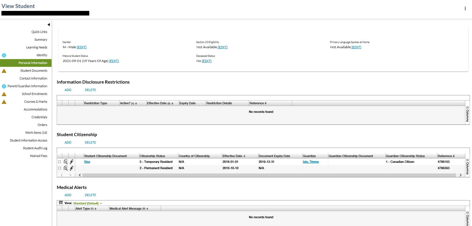 | DELETE | Selecting this action after selecting a record from the grid will open the Delete Student Citizenship confirmation dialog. If confirmed, then this will allow the user to delete the Student Citizenship record. After the student citizenship record has been marked as deleted, the user is returned back to the “Personal Information” subtab on the View Student page. Note: The action will be visible if the user has PASIprep Level 02 Permission and an association By Last School Enrolment, or higher. | |