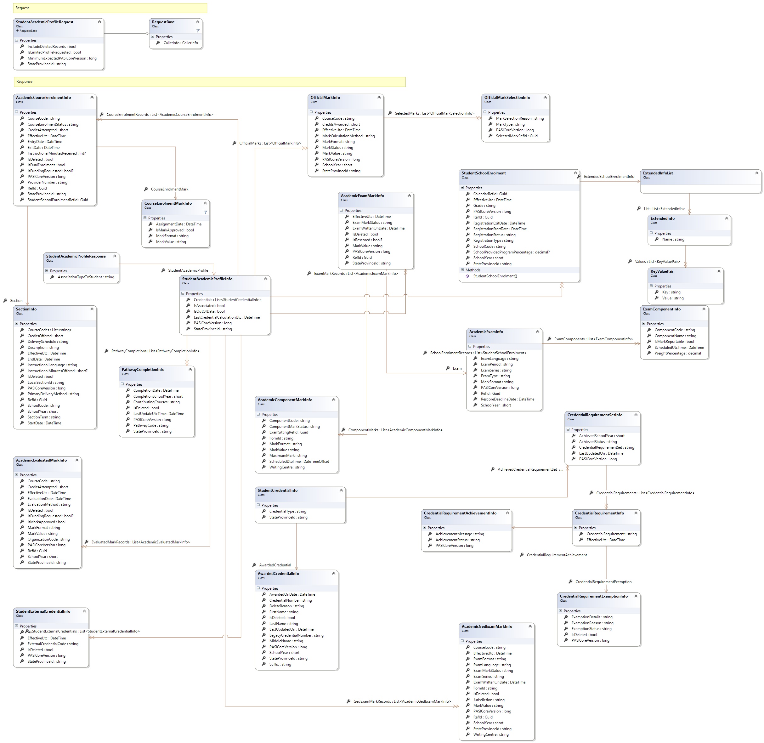 Full Academic Profile - A full academic profile return all academic records including School Enrolments, Course Enrolments, Evaluated Marks, Exam Marks, GED Exam Marks, Official Marks, Student Credentials information and Student Credential last calculation time.
