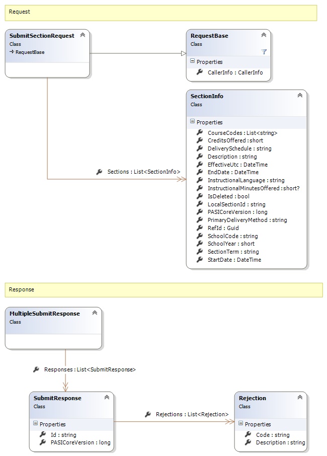 The request contains a single record or a list of SectionInfo data contract to be submitted to PASI Core.