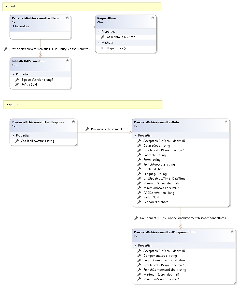 This service will return the Provincial Achievement Test(s) based on the Provincial Achievement Test RefId(s) passed in.